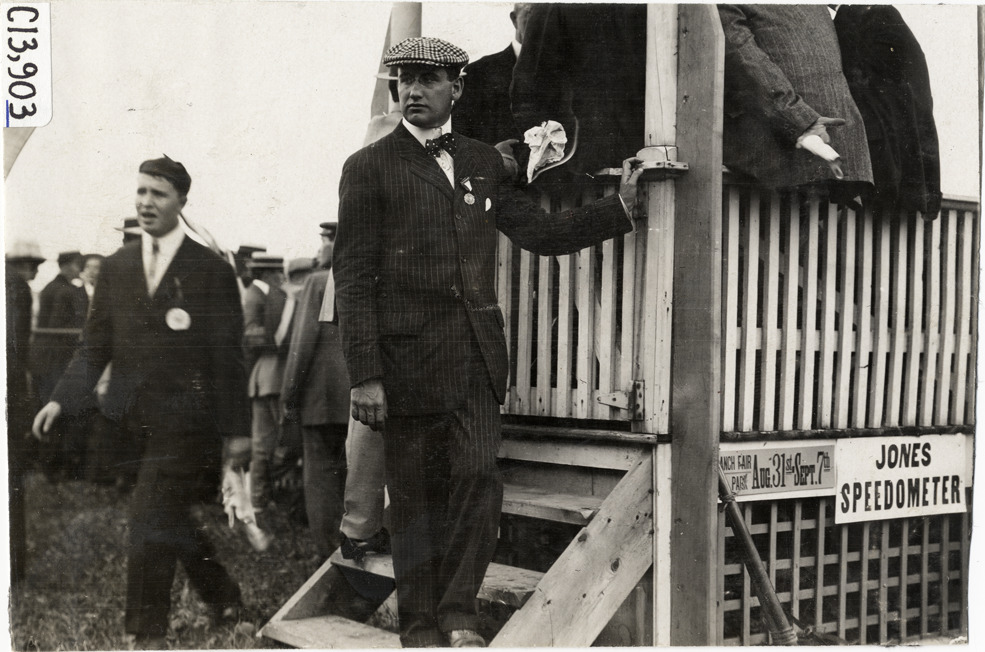 View of racing official standing on steps of timers' stand during the 1908 automobile races at the Elkwood Park racetrack in Long Branch, New Jersey. Stamped on back: "Spooner & Wells, Inc., photographers, telephones 3472-3473 Columbus, 1931 Broadway, New York." Handwritten on back: "Races and racing--Long Branch races, 1908."