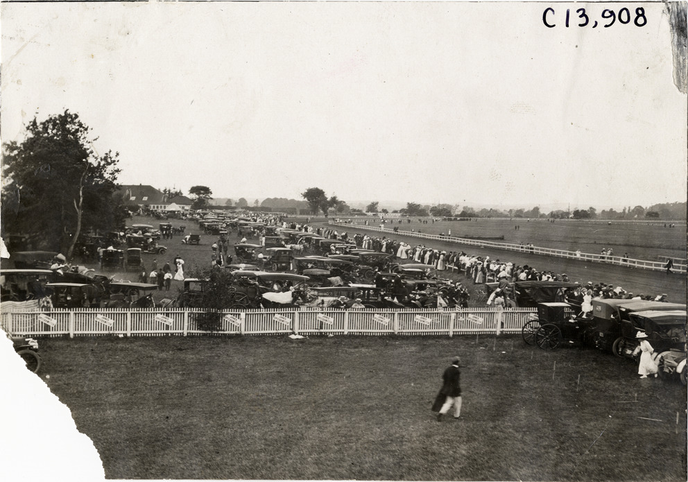 View of cars in parking area during the 1908 automobile races at the Elkwood Park racetrack in Long Branch, New Jersey. Spectators in foreground and background. Stamped on back: "Spooner & Wells, Inc., photographers, telephones 3472-3473 Columbus, 1931 Broadway, New York." Handwritten on back: "Races and racing--Long Branch races, 1908."