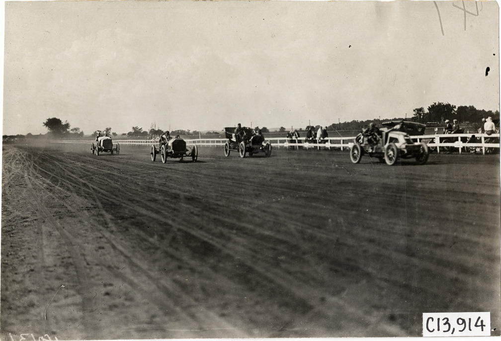 Cars racing on track, 1908 Long Branch races