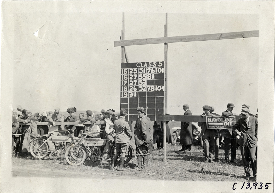 Men with motorcycles standing in front of scoreboard, 1909 Long Island Derby
