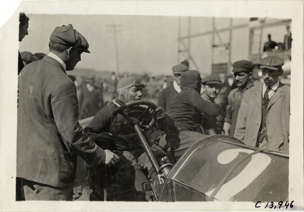 Driver and passenger in racecar, 1909 Long Island Derby