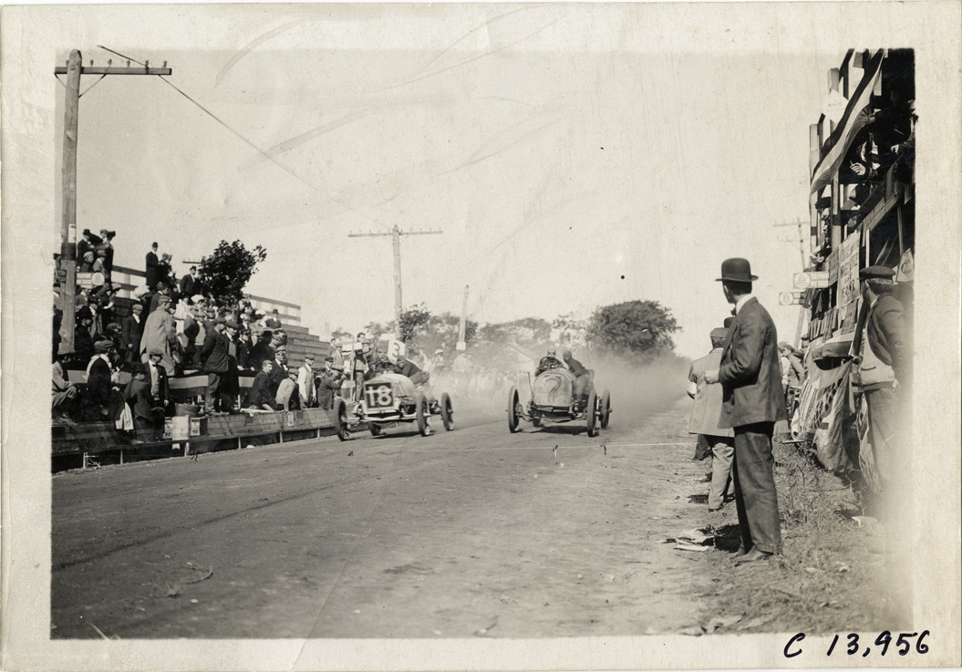 View of car no. 18 and car no. 7 racing past spectators in bleachers during the 1909 Long Island Derby in New York. Stamped on back: "Photo by Spooner & Wells, Inc. 1931 Broadway, N.Y." Handwritten on back: "Races and racing--Long Island Derby, 1909."
