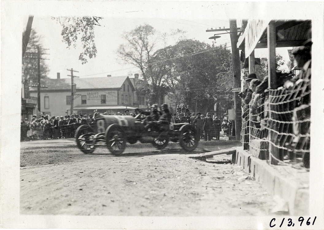 View of driver and passenger racing car no. 8 on course during the 1909 Long Island Derby in New York. Spectators in background. Stamped on back: "Photo by Spooner & Wells, Inc. 1931 Broadway, N.Y." Handwritten on back: "Races and racing--Long Island Derby, 1909."