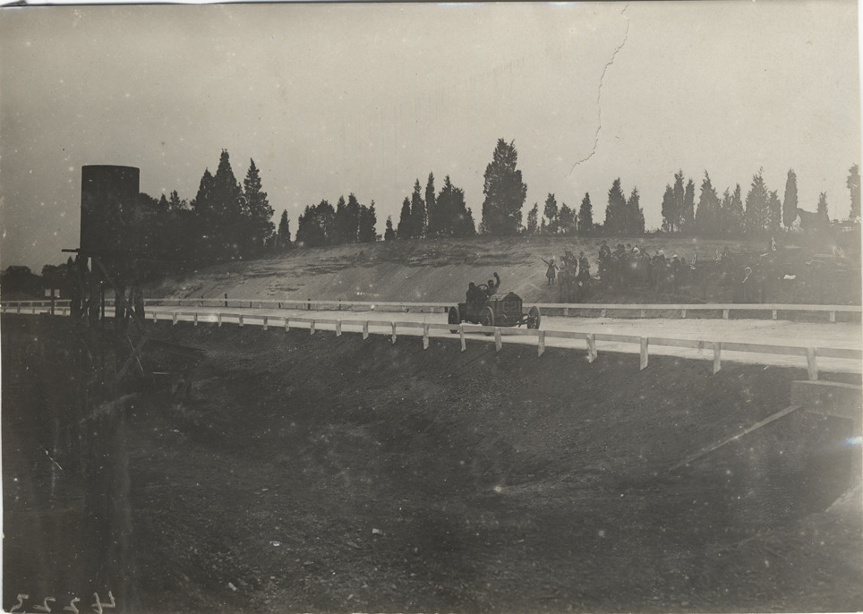 Driver and passenger in racecar, 1908 Long Island Sweepstakes