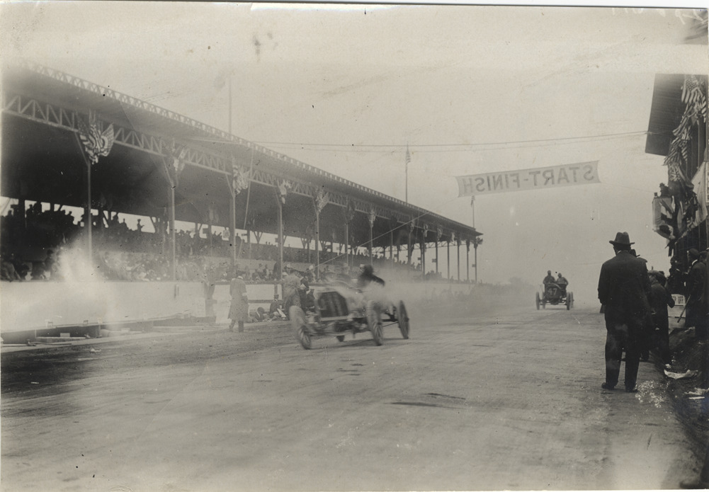 View of driver and passenger racing car past grandstand during the 1908 Long Island Sweepstakes in New York. "Start-Finish" banner is suspended overhead. Stamped on back: "Spooner & Wells, Inc., photographers, telephones 3472-3473 Columbus, 1931 Broadway, New York." Handwritten on back: "Races and racing--Long Island Sweepstakes, 1908."