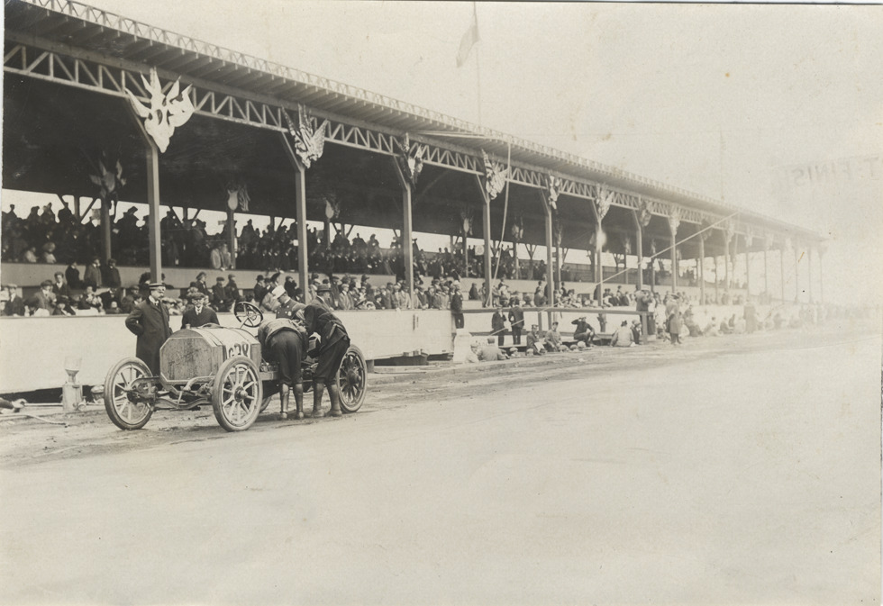 Driver and mechanic working on racecar, 1908 Long Island Sweepstakes