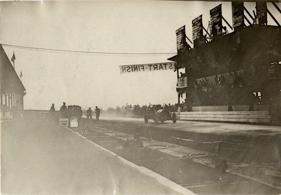 View of driver and passenger racing car past judges' or timers' stand during the 1908 Long Island Sweepstakes in New York. "Start-Finish" banner is suspended overhead. Stamped on back: "Spooner & Wells, Inc., photographers, telephones 3472-3473 Columbus, 1931 Broadway, New York." Handwritten on back: "Races and racing--Long Island Sweepstakes, 1908."