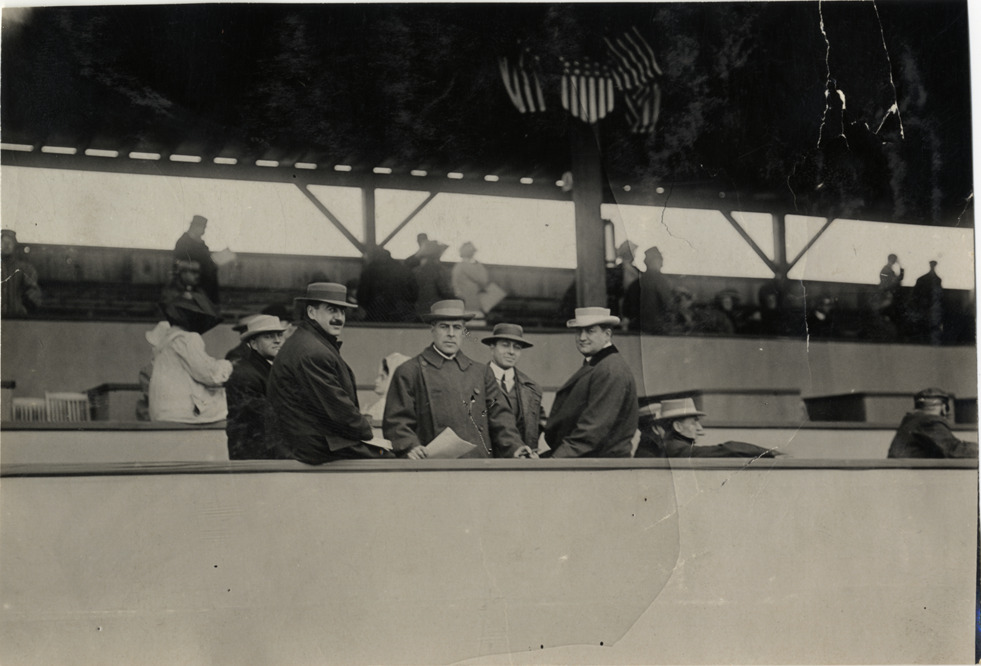 Officials in grandstand, 1908 Long Island Sweepstakes