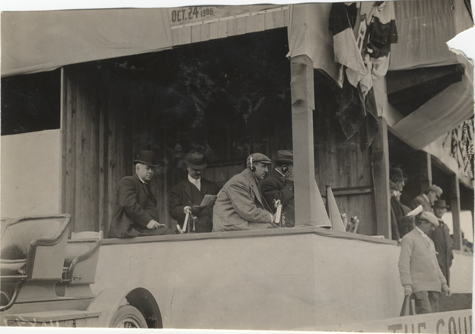 Men with telephones and megaphones in stand, 1908 Long Island Sweepstakes