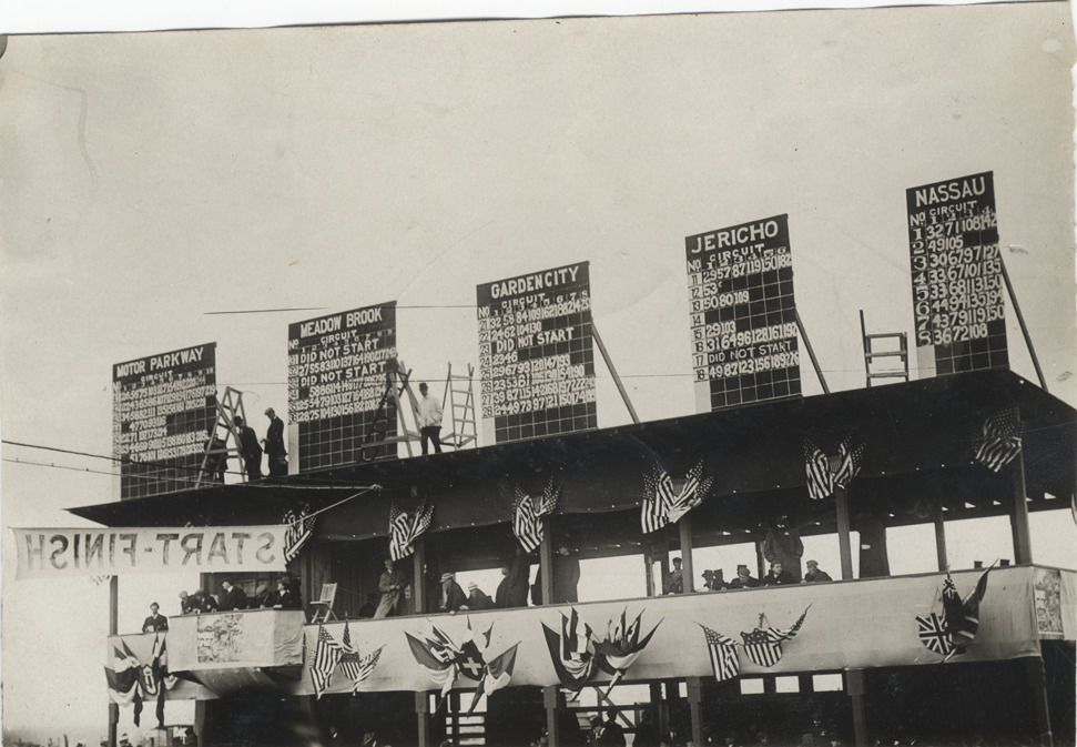 View of scoreboards or tally boards atop timers' or judges' stand during the 1908 Long Island Sweepstakes in New York. "Start-Finish" banner is suspended overhead; boards list Motor Parkway, Meadow Brook, Garden City, Jericho and Nassau sweepstakes races. Stamped on back: "Spooner & Wells, Inc., photographers, telephones 3472-3473 Columbus, 1931 Broadway, New York." Handwritten on back: "Races and racing--Long Island Sweepstakes, 1908."