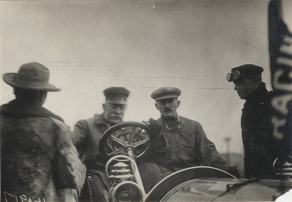 Close-up view of Jefferson De Mont Thompson and passenger in racecar during the 1908 Long Island Sweepstakes in New York. Stamped on back: "Spooner & Wells, Inc., photographers, telephones 3472-3473 Columbus, 1931 Broadway, New York." Handwritten on back: "Races and racing--Long Island Sweepstakes, 1908."