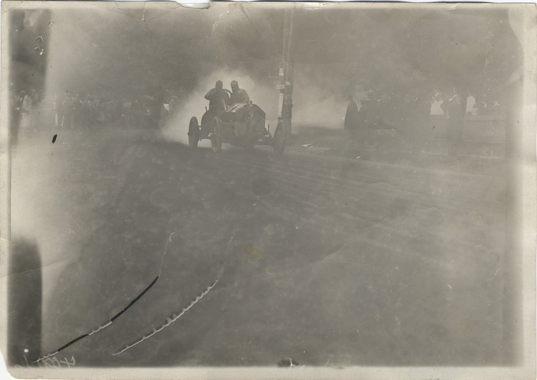 View of driver Herb Lytle and passenger racing Isotta-Fraschini car no. P42 on course during the 1908 Long Island Sweepstakes in New York. Handwritten on back: "Races and racing--Long Island Sweepstakes, 1908."