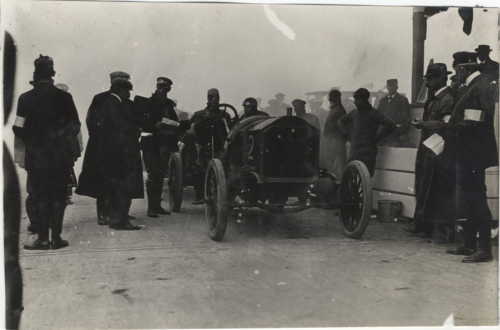 View of driver and passenger in car during the 1908 Long Island Sweepstakes in New York. Group of racing officials stands next to car. Stamped on back: "Spooner and Wells, 1931 Broadway, New York, duplicates any time, enlargements all sizes, tel. 3472-3473 Col., credit appreciated." Handwritten on back: "Races and racing--Long Island Sweepstakes, 1908."