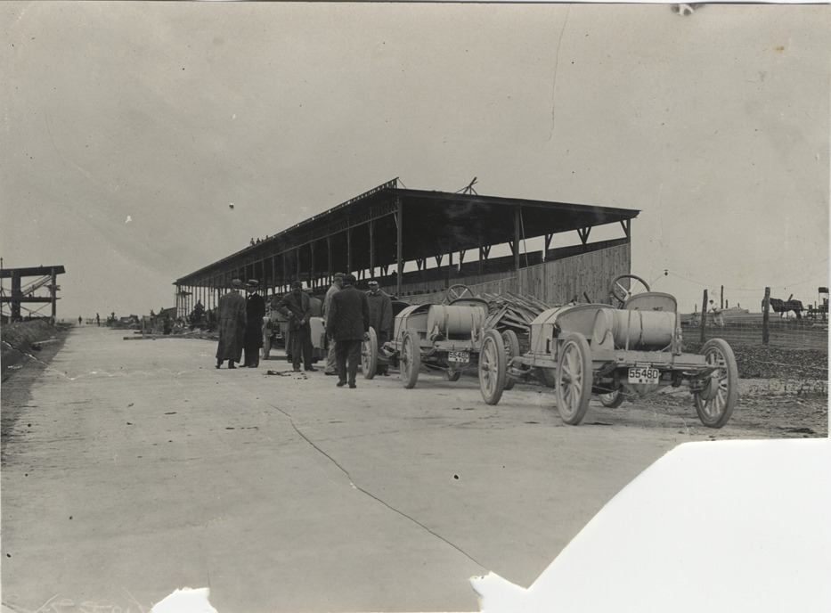 Racecars parked on side of track, 1908 Long Island Sweepstakes