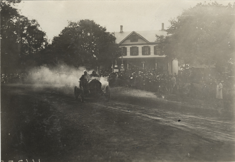 View of driver and passenger racing car no. P43 on course during the 1908 Long Island Sweepstakes in New York. Spectators and house in background. Stamped on back: "Spooner & Wells, Inc., photographers, telephones 3472-3473 Columbus, 1931 Broadway, New York." Handwritten on back: "Races and racing--Long Island Sweepstakes, 1908."
