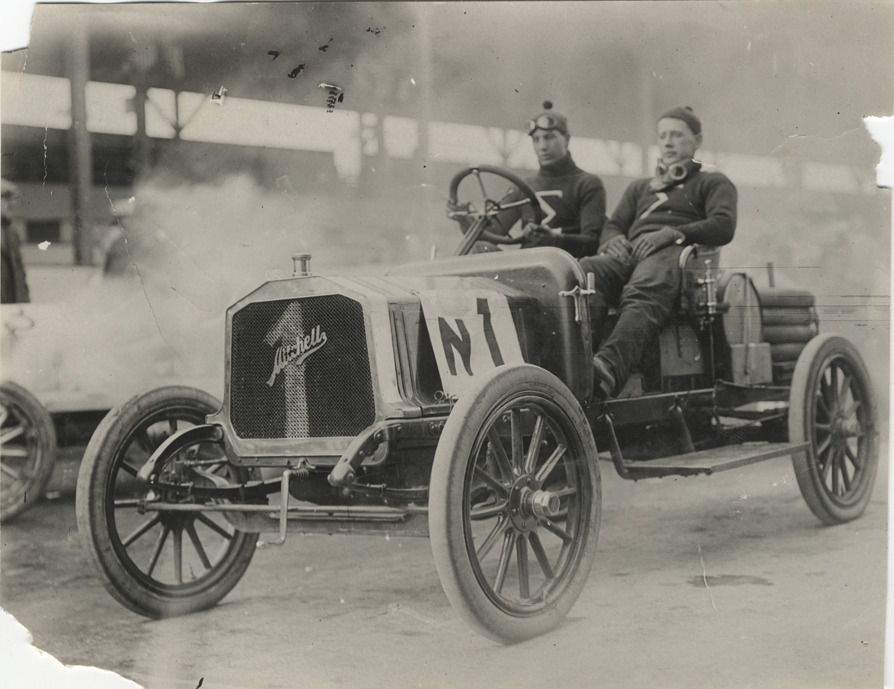 Driver and passenger in Mitchell racecar, 1908 Long Island Sweepstakes