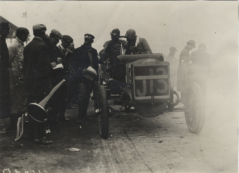 Driver and passenger in racecar, 1908 Long Island Sweepstakes