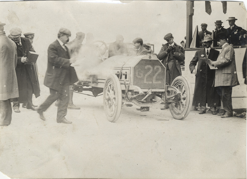 View of racing officials standing near car no. G22 on side of track during the 1908 Long Island Sweepstakes in New York. Stamped on back: "Spooner & Wells, Inc., photographers, telephones 3472-3473 Columbus, 1931 Broadway, New York." Handwritten on back: "Races and racing--Long Island Sweepstakes, 1908."