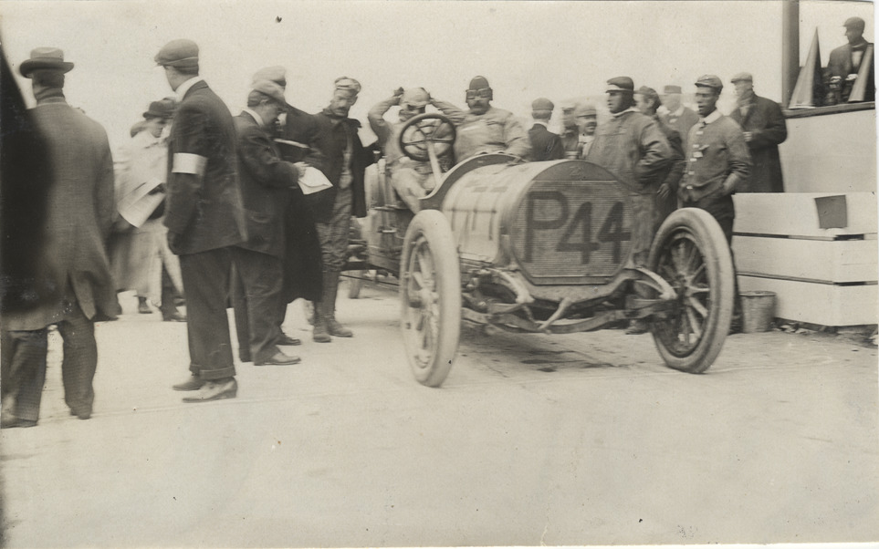 View of driver and passenger in car no. P44 on side of track during the 1908 Long Island Sweepstakes in New York. Group of racing officials surround car. Stamped on back: "Spooner & Wells, Inc., photographers, telephones 3472-3473 Columbus, 1931 Broadway, New York." Handwritten on back: "Races and racing--Long Island Sweepstakes, 1908."