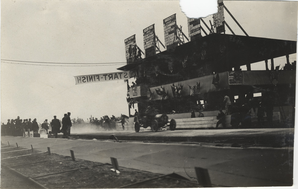 View of driver and passenger racing car past judges' or timers' stand during the 1908 Long Island Sweepstakes in New York. "Start-Finish" banner is suspended overhead. Stamped on back: "Spooner & Wells, Inc., photographers, telephones 3472-3473 Columbus, 1931 Broadway, New York." Handwritten on back: "Races and racing--Long Island Sweepstakes, 1908."