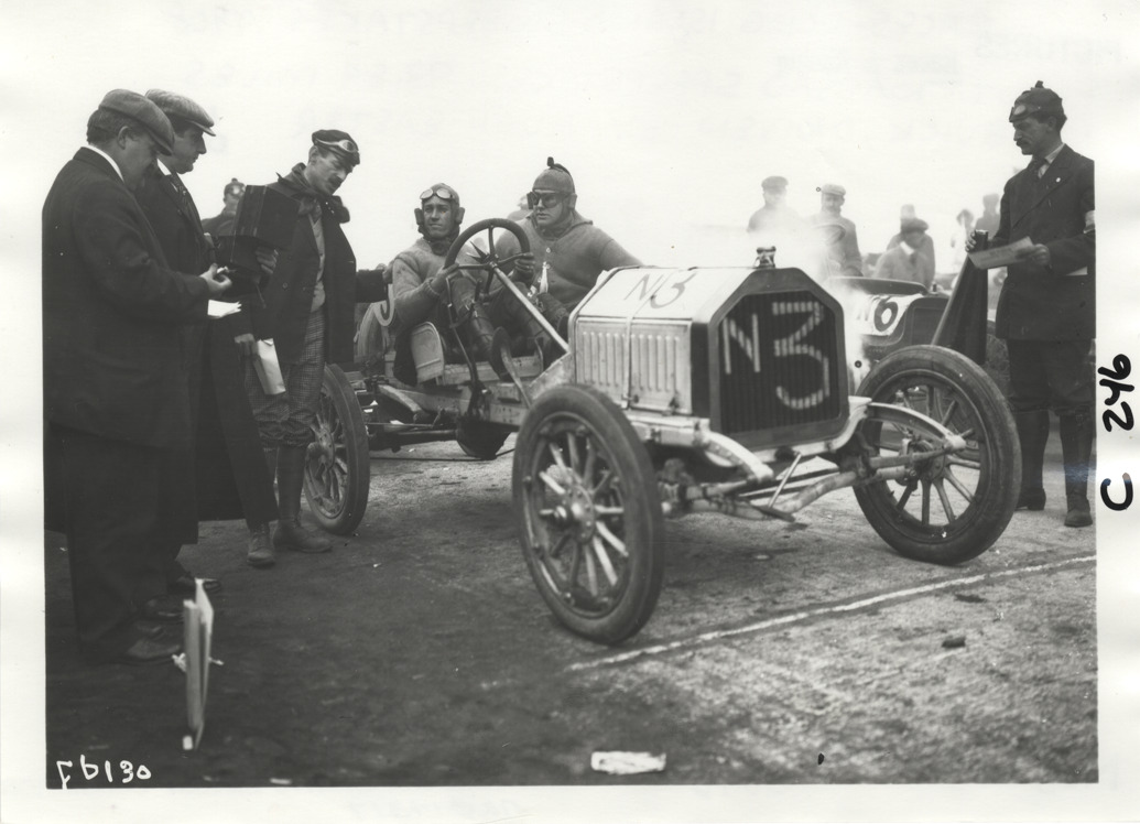 View of Fred Wagner standing next to driver Hugh Easter and passenger in Buick car no. N3 during the 1908 Long Island Sweepstakes in New York. Other racing officials stand nearby; announcer with megaphone on right. Handwritten on back: "Nassau sweepstakes, 93.84 miles, N3 Buick, driven by Hugh Easter. Races and racing--Long Island Sweepstakes, 1908."