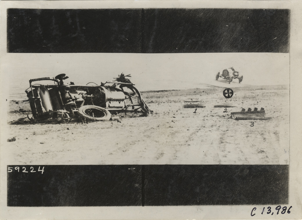 View of damaged, overturned racecar during the 1910 Los Angeles races at the Los Angeles Motordrome in California. Pieces of car (numbered) on ground; car no. 8 in background. Stamped on back: "Spooner & Wells, Inc., photographers, telephones 3472-3473 Columbus, 1931 Broadway, New York." Handwritten on back: "Races and racing--Los Angeles races, 1910."