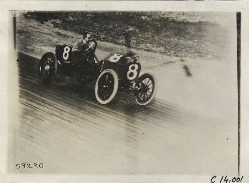 View of driver racing car no. 8 on track during the 1910 Los Angeles races at the Los Angeles Motordrome in California. Stamped on back: "Spooner & Wells, Inc., photographers, telephones 3472-3473 Columbus, 1931 Broadway, New York." Handwritten on back: "Races and racing--Los Angeles races, 1910."