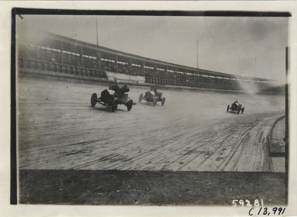 View of cars racing on track during the 1910 Los Angeles races at the Los Angeles Motordrome in California. Stamped on back: "Spooner & Wells, Inc., photographers, telephones 3472-3473 Columbus, 1931 Broadway, New York." Handwritten on back: "Races and racing--Los Angeles races, 1910."