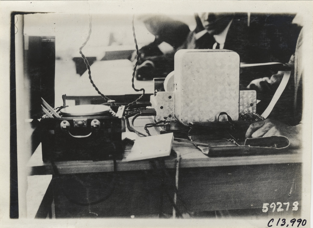 View of telegraph machine on table during the 1910 Los Angeles races at the Los Angeles Motordrome in California. Stamped on back: "Spooner & Wells, Inc., photographers, telephones 3472-3473 Columbus, 1931 Broadway, New York." Handwritten on back: "Races and racing--Los Angeles races, 1910."