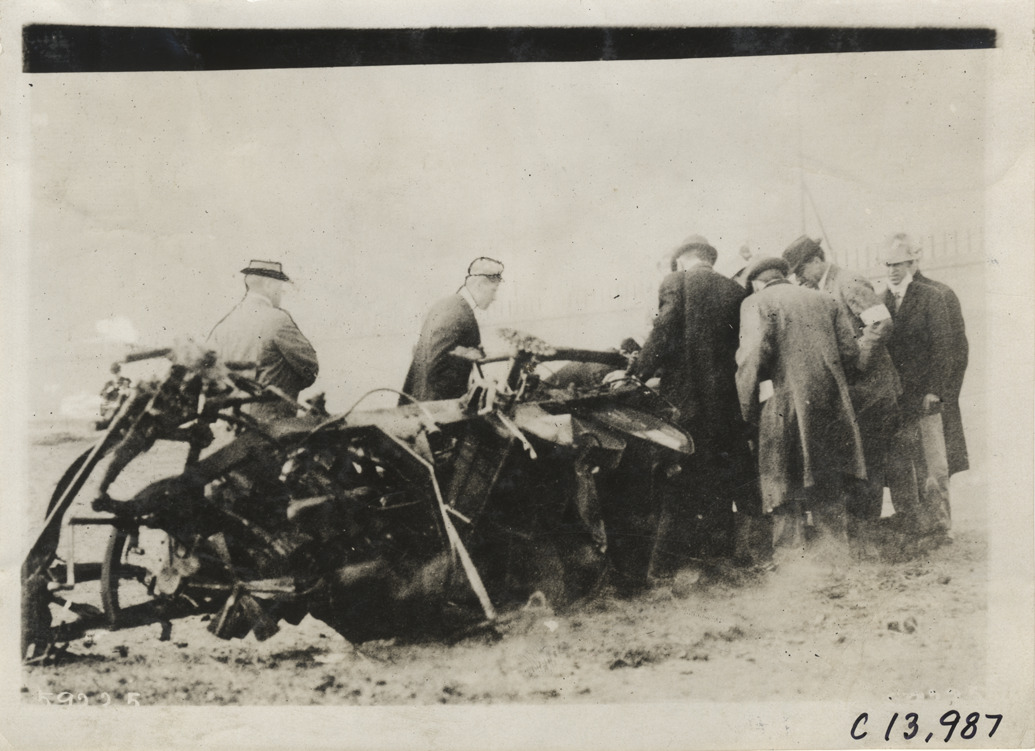 Men looking at overturned racecar, 1910 Los Angeles races