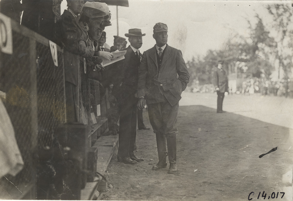 View of two racing officials during the 1908 Lowell road race in Lowell, Massachusetts. Spectators stand behind fence; policeman stands in center of track. Stamped on back: "Spooner & Wells, Inc., photographers, telephones 3472-3473 Columbus, 1931 Broadway, New York." Handwritten on back: "Races and racing--Lowell road race, 1908."