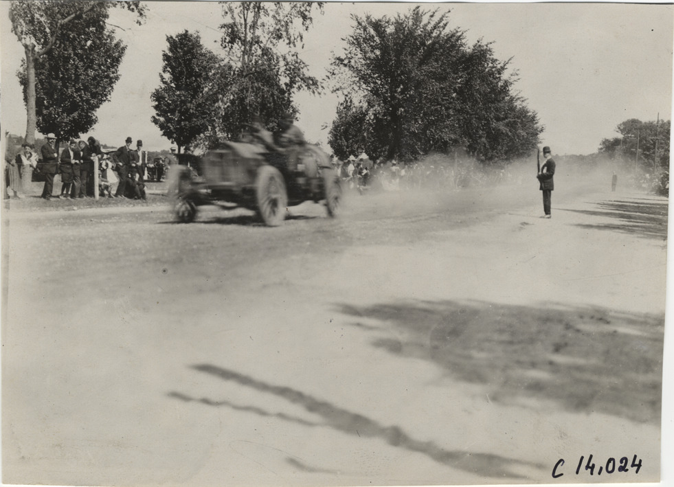 View of driver and passenger racing car on course during the 1908 Lowell road race in Lowell, Massachusetts. Official stands on roadside with flag. Handwritten on back: "Races and racing--Lowell road race, 1908."