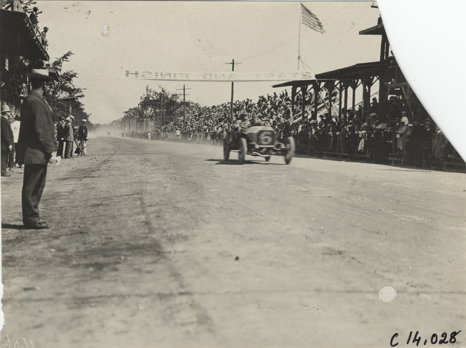 View of driver and passenger racing car no. 6 past spectators in bleachers during the 1908 Lowell road race in Lowell, Massachusetts. "Start and Finish" banner is suspended overhead. Handwritten on back: "Races and racing--Lowell road race, 1908."