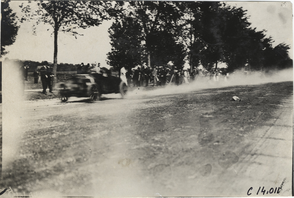 View of driver and passenger racing car on course during the 1908 Lowell road race in Lowell, Massachusetts. Spectators watch from roadside. Stamped on back: "Spooner & Wells, Inc., photographers, telephones 3472-3473 Columbus, 1931 Broadway, New York." Handwritten on back: "Races and racing--Lowell road race, 1908."
