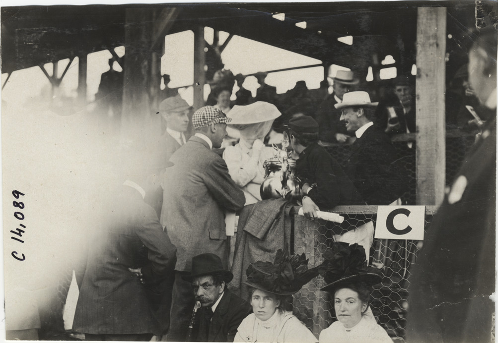 View of Butler Ames and Mr. and Mrs. Tyson in grandstand with Butler Ames trophy cup during the 1908 Lowell road race in Lowell, Massachusetts. Stamped on back: "Spooner & Wells, Inc., photographers, telephones 3472-3473 Columbus, 1931 Broadway, New York." Handwritten on back: "Races and racing--Lowell road race, 1908."