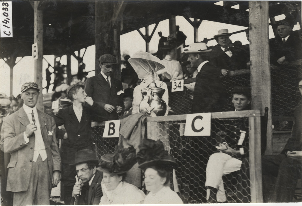 View of Butler Ames and Mr. and Mrs. Tyson in grandstand with Butler Ames trophy cup during the 1908 Lowell road race in Lowell, Massachusetts. Handwritten on back: "Races and racing--Lowell road race, 1908."