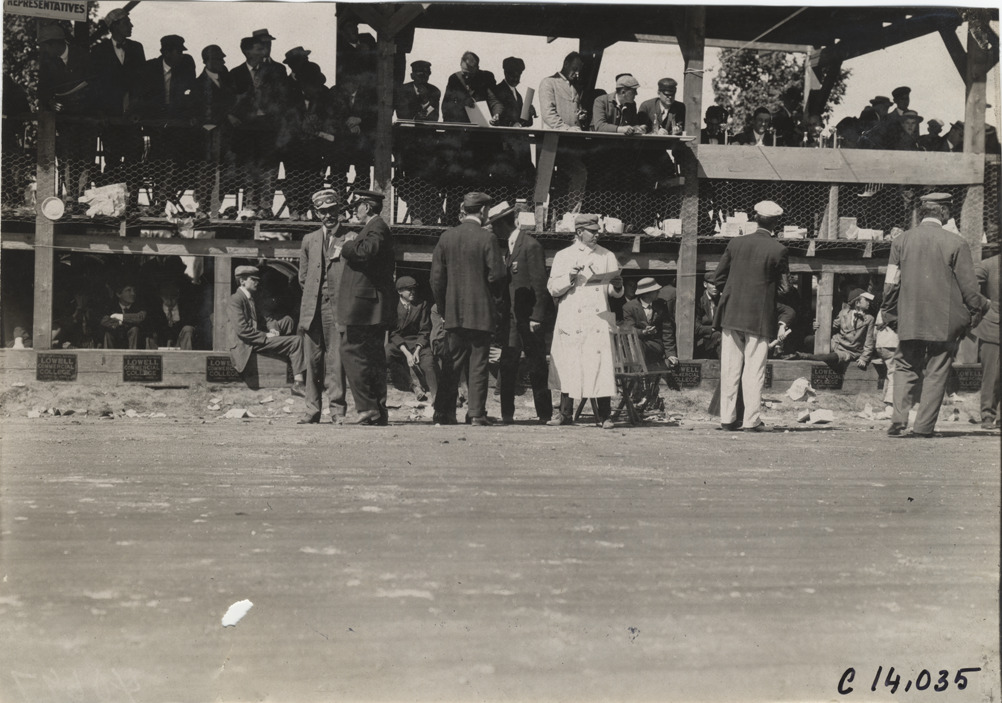 Officials in front of viewing stand, 1908 Lowell road race