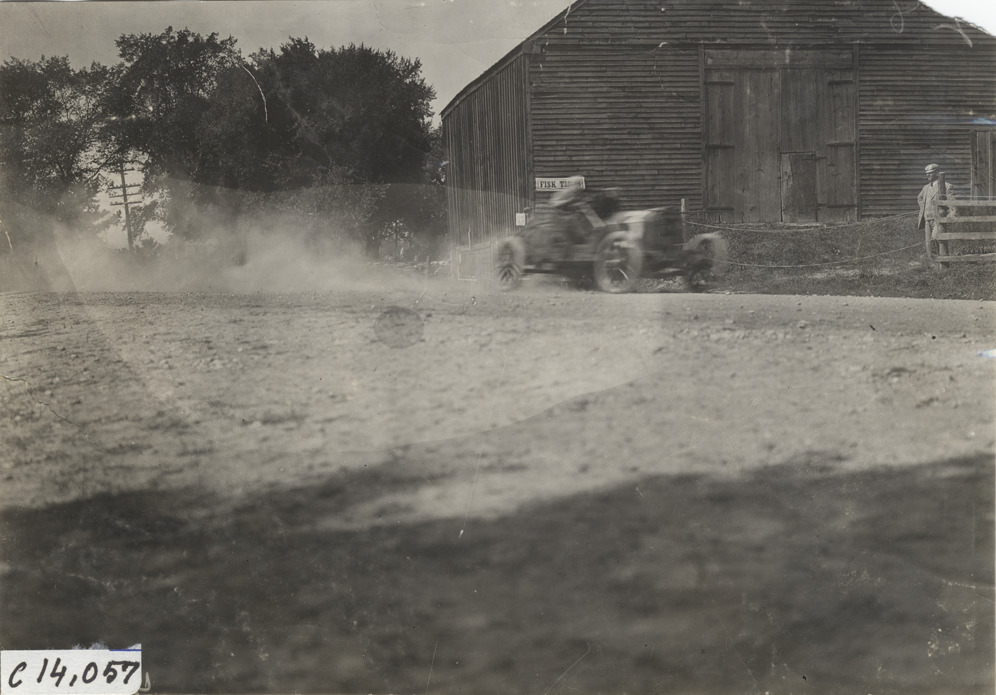 View of car racing past barn during the 1908 Lowell road race in Lowell, Massachusetts. Stamped on back: "Spooner & Wells, Inc., photographers, telephones 3472-3473 Columbus, 1931 Broadway, New York." Handwritten on back: "Races and racing--Lowell road race, 1908."