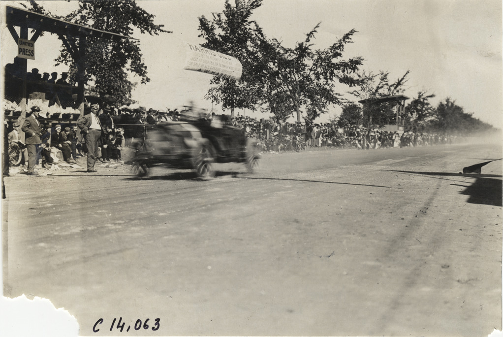 View of driver and passenger racing car past spectators on roadside during the 1908 Lowell road race in Lowell, Massachusetts. "Harris oils" banner is displayed on roadside. Stamped on back: "Spooner & Wells, Inc., photographers, telephones 3472-3473 Columbus, 1931 Broadway, New York." Handwritten on back: "Races and racing--Lowell road race, 1908."