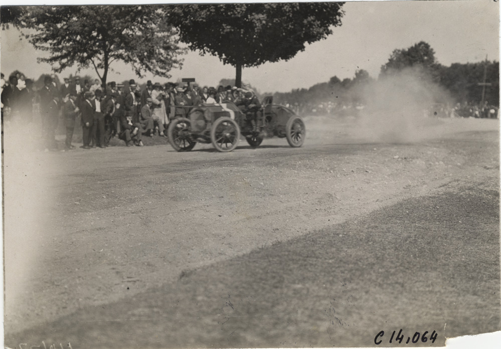 View of Louis Strang and passenger racing Isotta-Fraschini car no. 3 past spectators during the 1908 Lowell road race in Lowell, Massachusetts. Stamped on back: "Spooner & Wells, Inc., photographers, telephones 3472-3473 Columbus, 1931 Broadway, New York." Handwritten on back: "Isotta, Strang driving. Races and racing--Lowell road race, 1908."