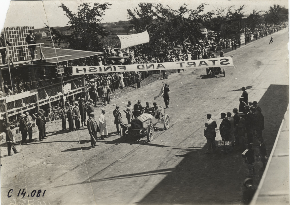 Bird's-eye view of driver and passenger in car no. 6 at start-finish line during the 1908 Lowell road race in Lowell, Massachusetts. Racing officials stand nearby; "Start-Finish" banner is suspended overhead. Handwritten on back: "Races and racing--Lowell road race, 1908."