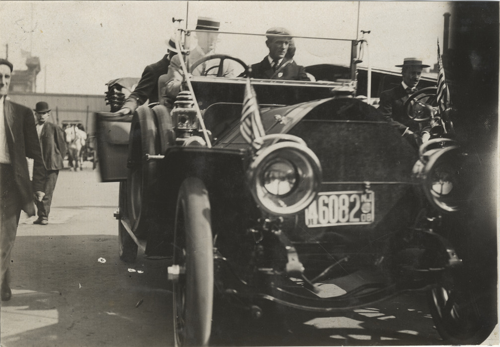 Motorists in automobile, 1908 New York to Paris Race