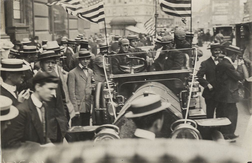 Front view of onlookers standing around motorists in car during 1908 New York to Paris Race. Car is decorated with American flags. Stamped on back: "Spooner & Wells, Inc., photographers, telephones 3472-3473 Columbus, 1931 Broadway, New York." Handwritten on back: "Races and racing--New York to Paris, 1908."