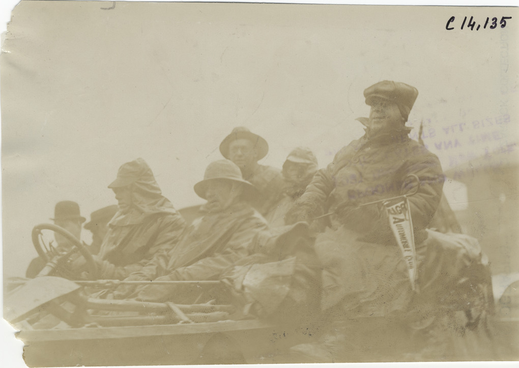 Motorists in automobile, 1908 New York to Paris Race