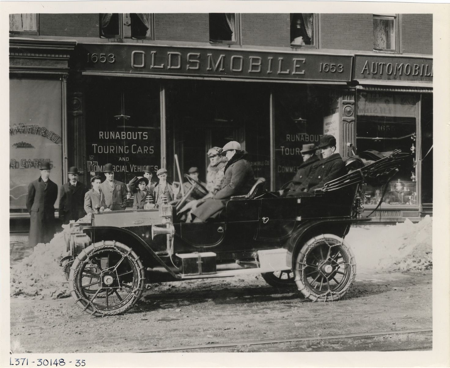 View of four men posing in car in front of Oldsmobile dealership during 1908 New York to Paris Race. Onlookers stand on sidewalk. Handwritten on back: "Races and racing--New York to Paris, 1908."