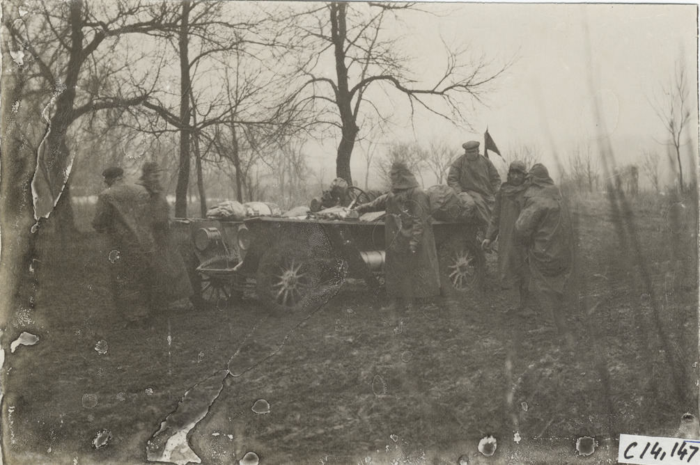View of several men, wearing raingear, standing with car on rural road during 1908 New York to Paris Race. Handwritten on back: "Races and racing--New York to Paris, 1908."