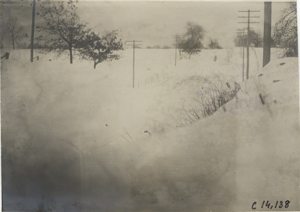 View of snow-covered rural road during 1908 New York to Paris Race. Stamped on back: "Spooner and Wells, 1931 Broadway, New York, duplicates any time, enlargements all sizes, tel. 3472-3473 Col., credit appreciated." Handwritten on back: "Races and racing--New York to Paris, 1908."