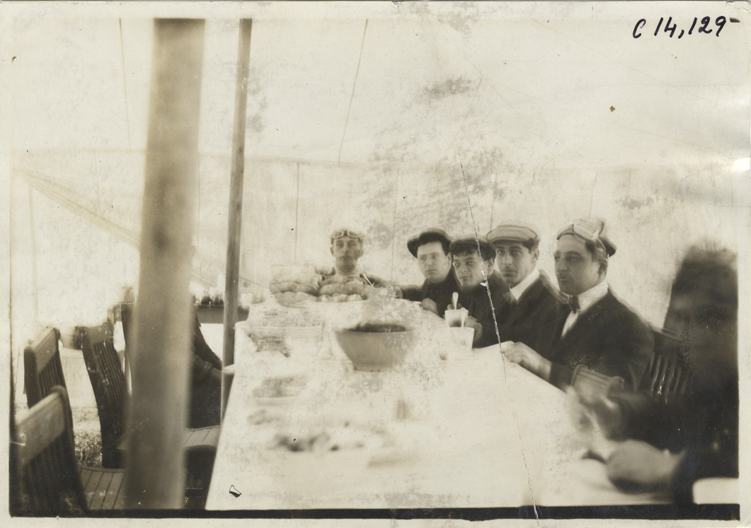 View of men sitting around dining table during 1908 New York to Paris Race. Stamped on back: "Spooner and Wells, 1931 Broadway, New York, duplicates any time, enlargements all sizes, tel. 3472-3473 Col., credit appreciated." Handwritten on back: "Races and racing--New York to Paris, 1908."