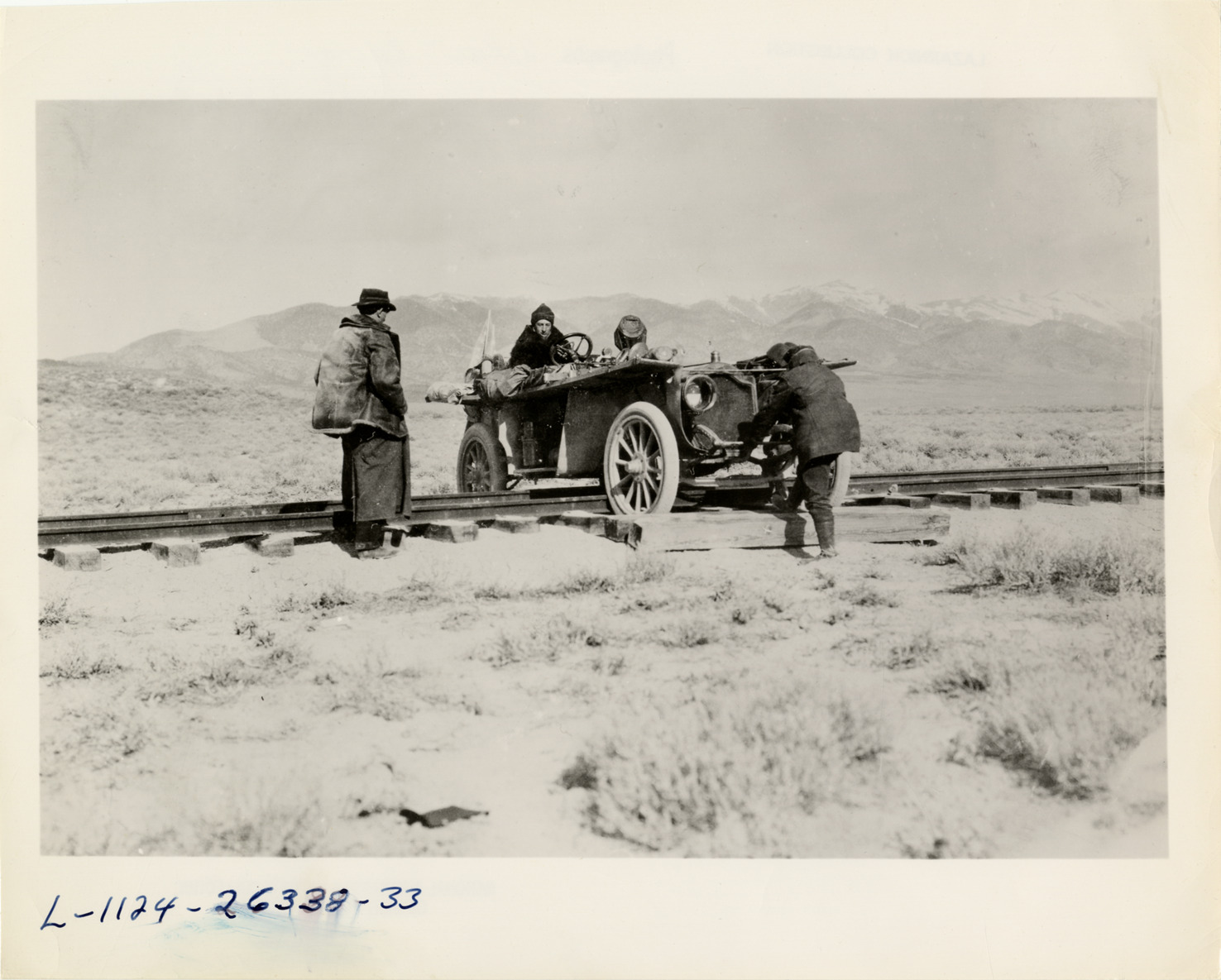 View of motorists with Thomas Flyer car crossing Western Pacific Railroad tracks near Cobrey, Nevada during 1908 New York to Paris Race. Typed on back: "Difficulties are encountered when the New York-to-Paris Thomas Flyer crossed the Western Pacific Railroad tracks 30 miles from Cobrey, Nevada in 1908." Handwritten on back: "Races and racing--New York to Paris, 1908."