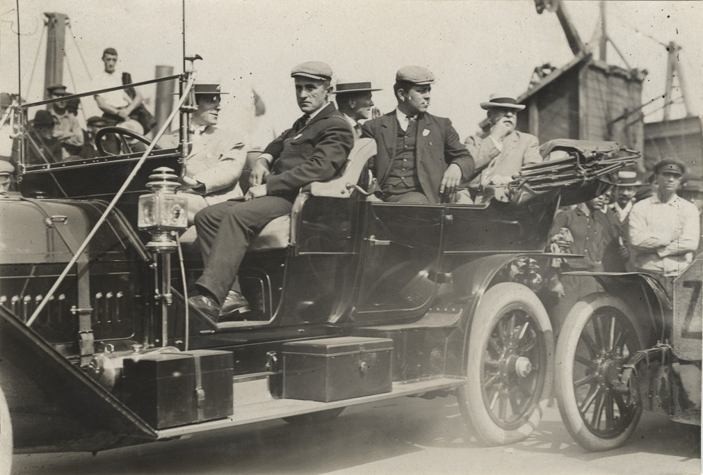 Motorists in automobile on dock, 1908 New York to Paris Race
